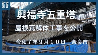 Kofukuji’s Five-Story Pagoda, a National Treasure in Nara, opened part of its large-scale restoration to the media with a demonstration of roof tile removal. The project includes examining whether some 60,000 tiles can be reused.